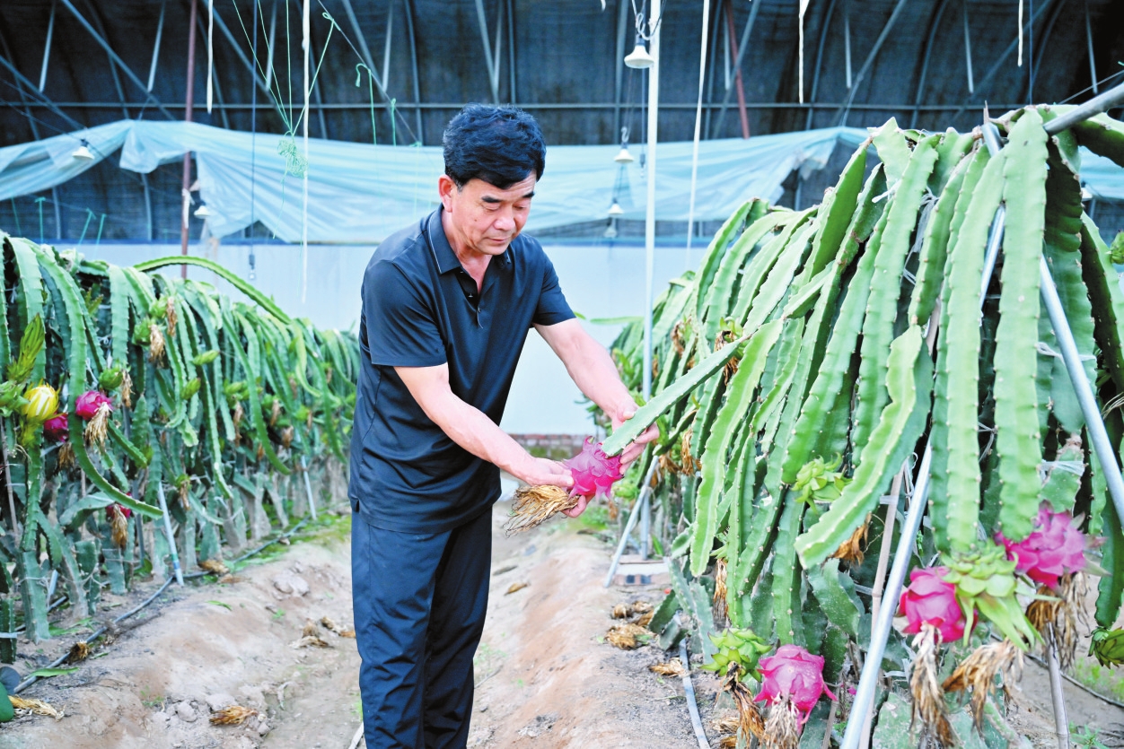 鄔瑞華正在觀察火龍果長(zhǎng)勢(shì)。本報(bào)記者馮曉磊攝
