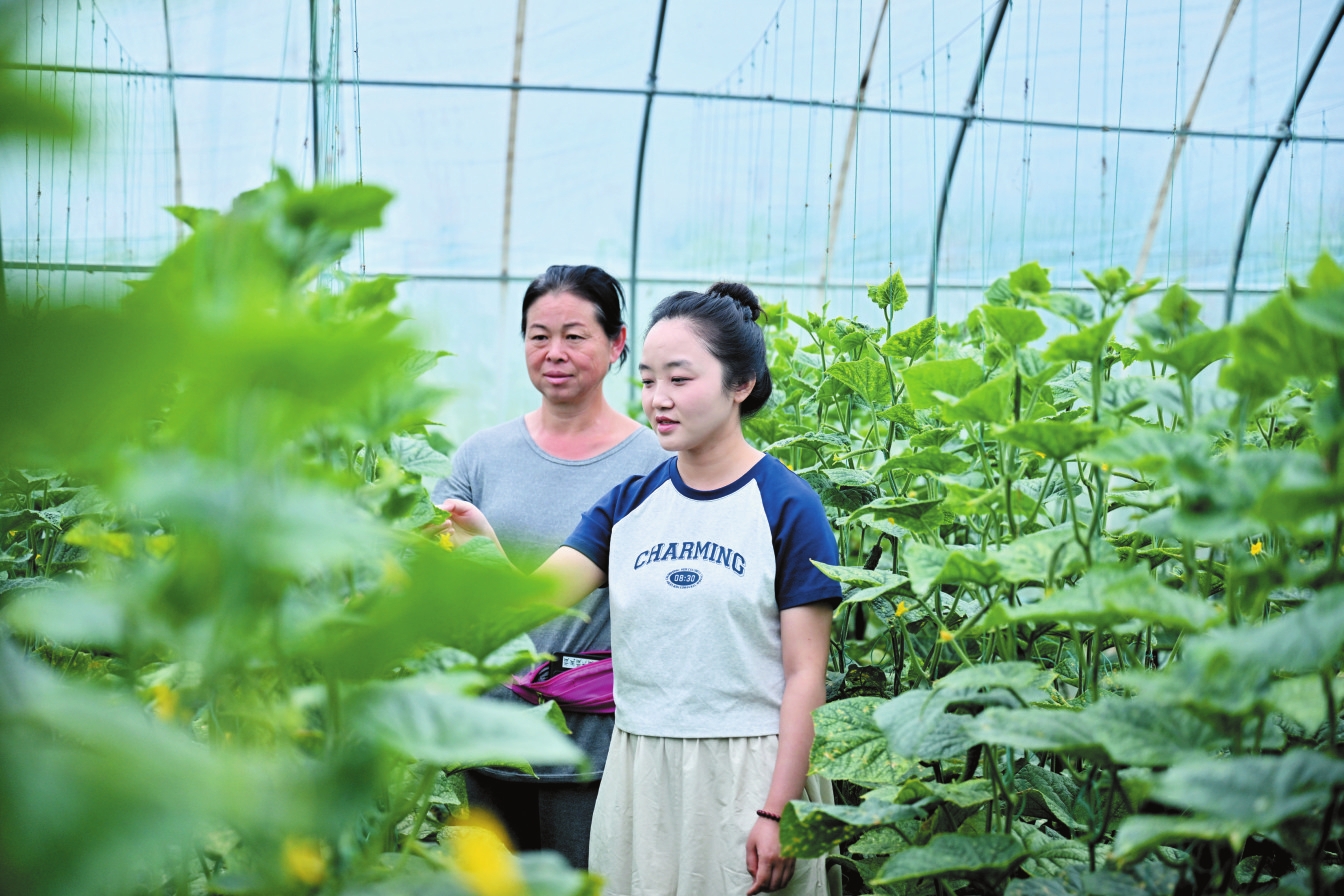 保德縣暖泉村駐村大學(xué)生正在觀察黃瓜長勢。本報記者 馮曉磊攝