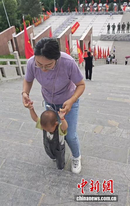 蹣跚學(xué)步的孩子正在攀爬象征紀念115師的115級臺階。 記者 郎朗 攝